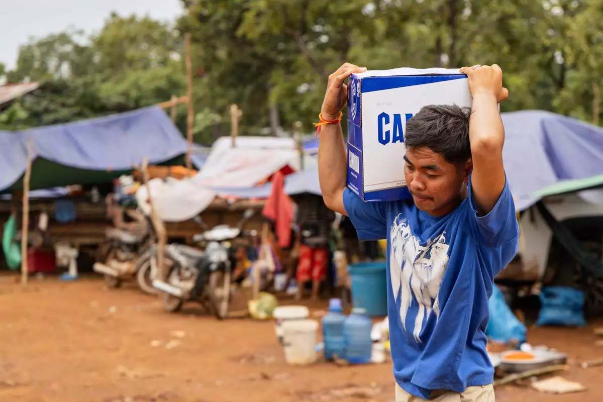 A man carries a box of water handed out at the Battkhao Resettlement Camp for displaced Cambodians in Oddar Meanchey Province on Saturday, July 26, 2025. (AP Photo/Anton L. Delgado)