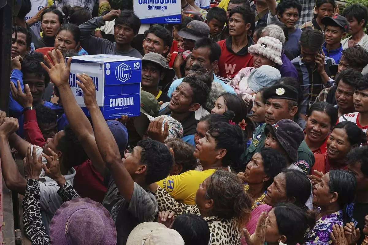 Cambodians crowd to receive drinking water donated by a local company, named Cambodia, as they take refuge in Batthkoa primary school in Oddar Meanchey province, Cambodia, Saturday, July 26, 2025, as border fighting between Thailand and Cambodia entered its third day. (AP Photo/Heng Sinith)