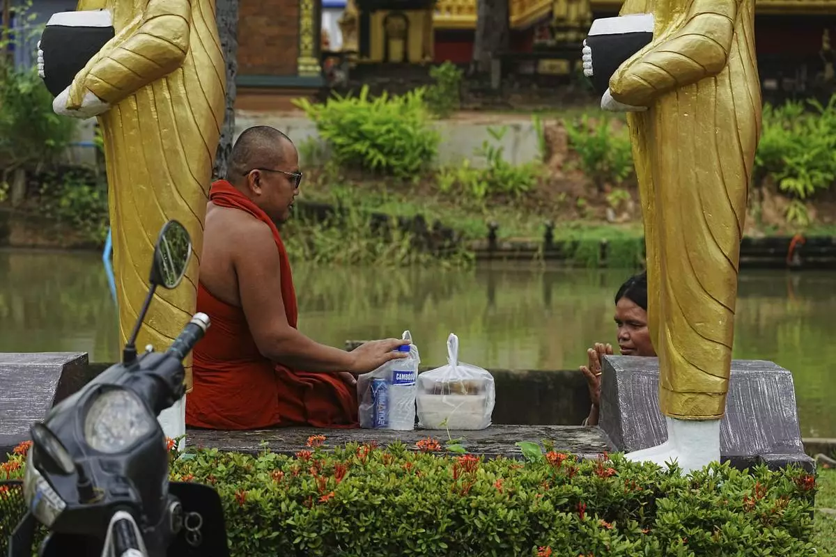 A Cambodian Buddhist monk, left, receives food from a devotee, right, in Wat Prasat Samrong Pagoda in Oddar Meanchey province, Cambodia, Saturday, July 26, 2025, as border fighting between Thailand and Cambodia entered its third day. (AP Photo/Heng Sinith)