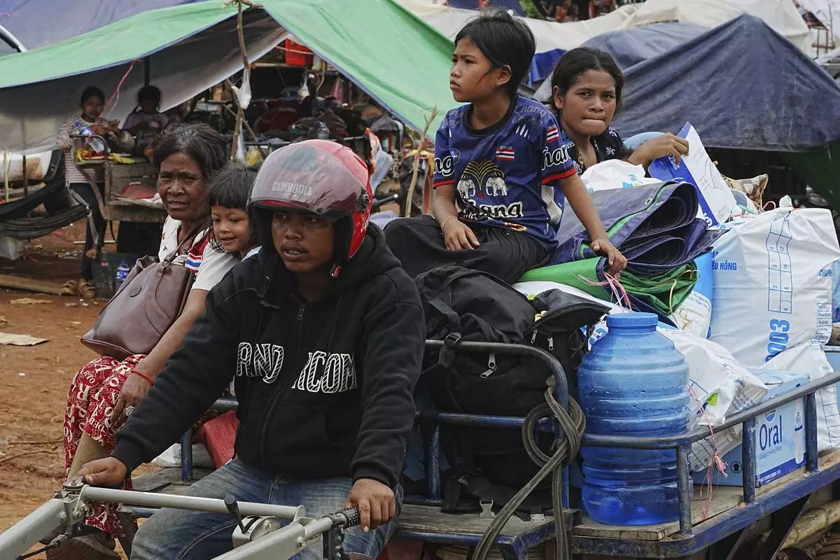 Cambodians sit on a tractor cart as they take refuge in Batthkoa primary school in Oddar Meanchey province, Cambodia, Saturday, July 26, 2025, as border fighting between Thailand and Cambodia entered its third day. (AP Photo/Heng Sinith)