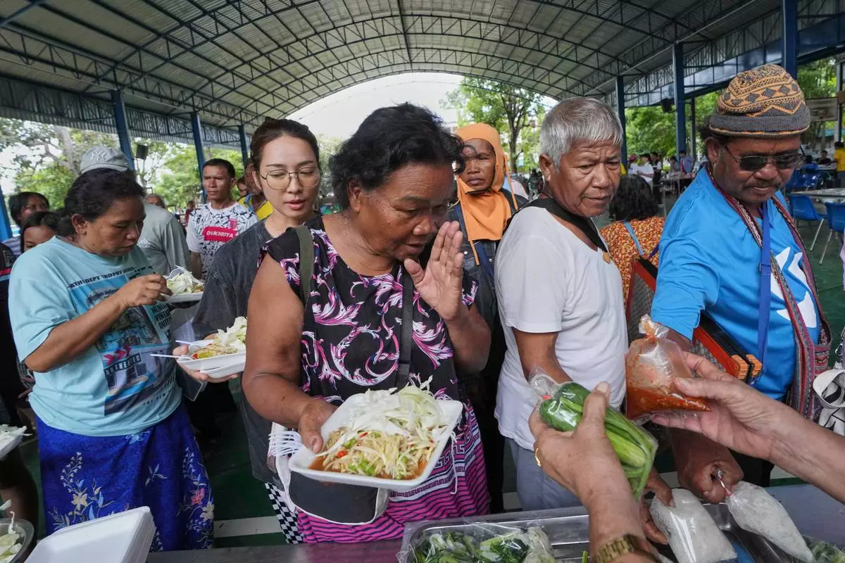 Thai residents who fled homes following clashes between Thai and Cambodian soldiers line up for food at an evacuation center in Surin province, Thailand, Saturday, July 26, 2025. (AP Photo/Sakchai Lalit)