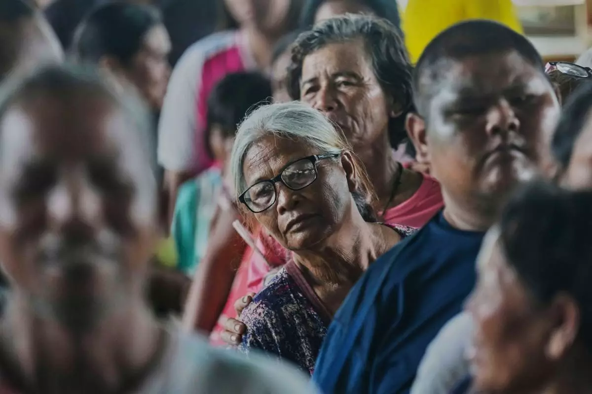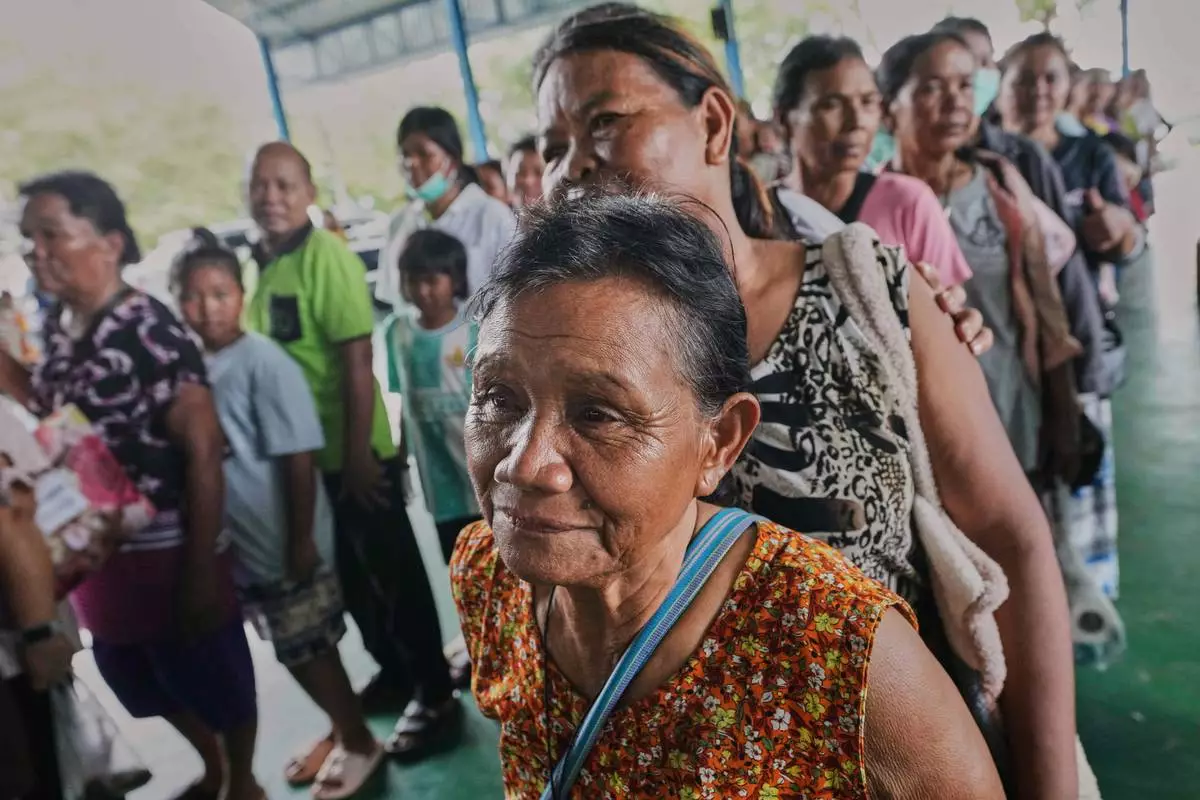 Thai residents who fled homes following clashes between Thai and Cambodian soldiers line up to receive toiletry distributed by a group of elderly in Surin who learn ballroom dance together, at an evacuation center in Surin province, Thailand, Saturday, July 26, 2025. (AP Photo/Sakchai Lalit)
