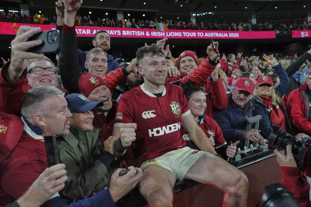 Hugo Keenan of the British & Irish Lions, who scored the winning try celebrates with fans after the second rugby union test against Australia at the Melbourne Cricket Ground in Melbourne, Australia, Saturday, July 26, 2025. (AP Photo/Asanka Brendon Ratnayake)