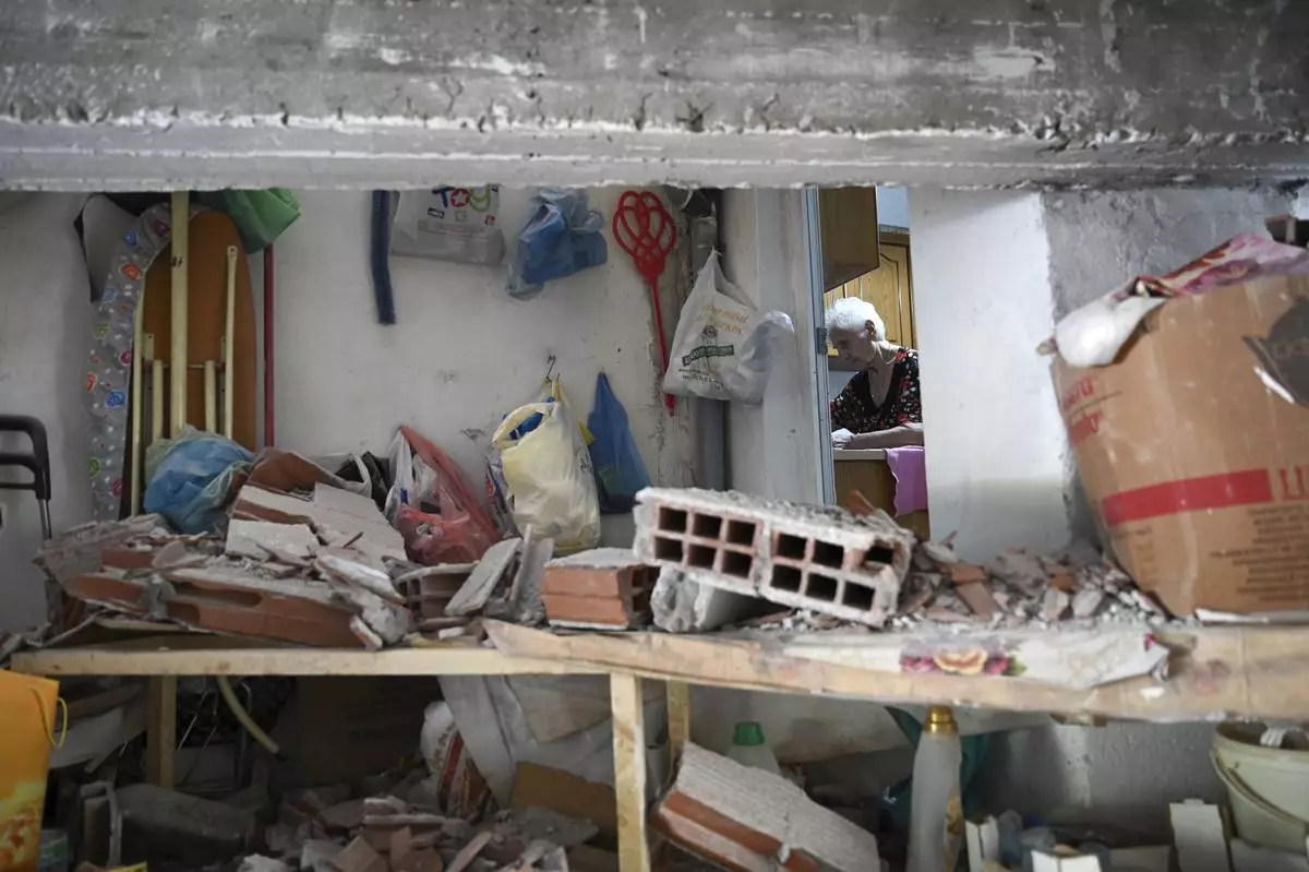 A woman is seen in her apartment after a wall collapsed following a bomb explosion, at the entrance of the home of president of the Greek association of prison guards, at a suburb of Thessaloniki, northern Greece, Saturday, July 26, 2025. (AP Photo/Giannis Papanikos)