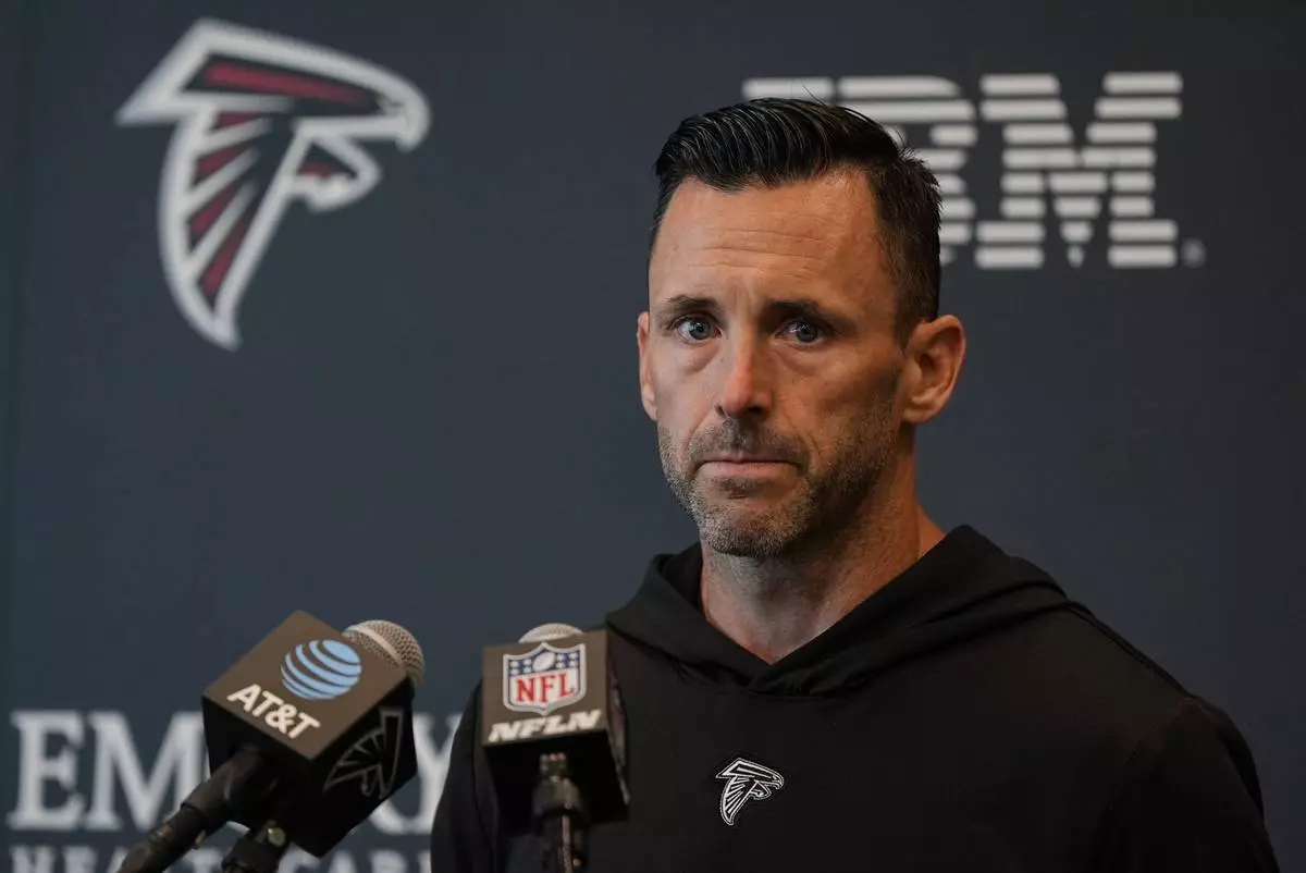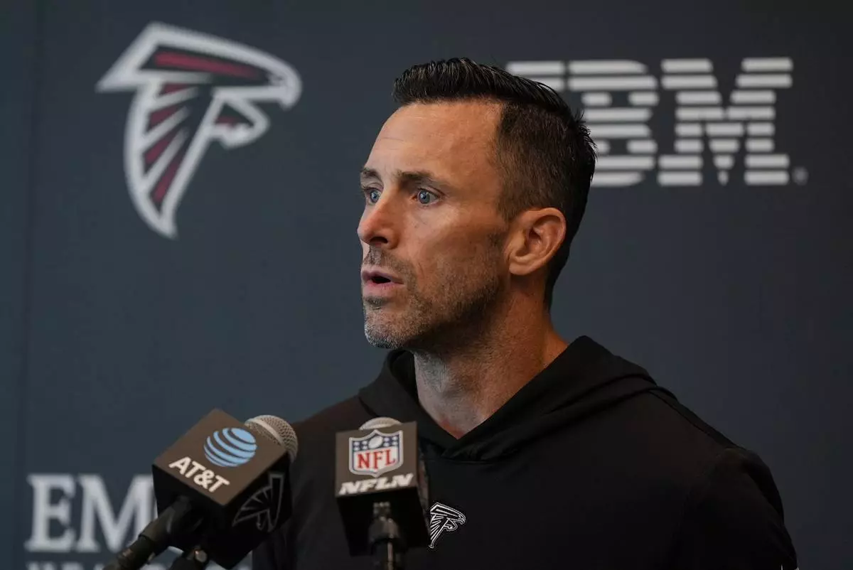 Assistant General Manager Kyle Smith speaks during an Atlanta Falcons training camp, Saturday, July 26, 2025, in Flowery Branch. (AP Photo/Mike Stewart)