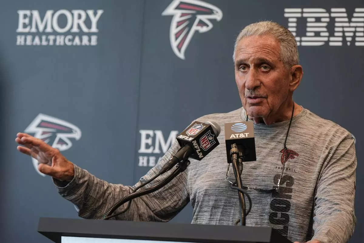Atlanta Falcons Owner Arthur Blank speaks during a Atlanta Falcons training camp, Saturday, July 26, 2025, in Flowery Branch. (AP Photo/Mike Stewart)
