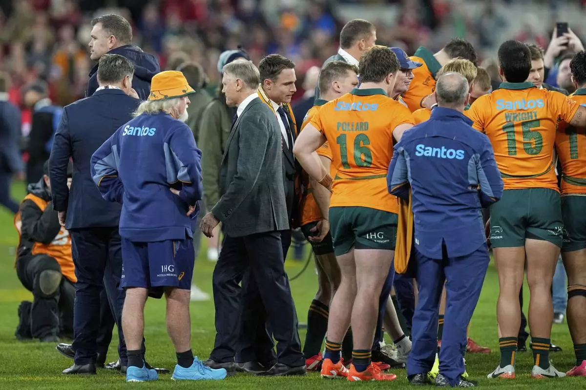Australia's coach Joe Schmidt, third left, leaves after his team lost the second rugby union test against the British & Irish Lions at the Melbourne Cricket Ground in Melbourne, Australia, Saturday, July 26, 2025. (AP Photo/Rick Rycroft)