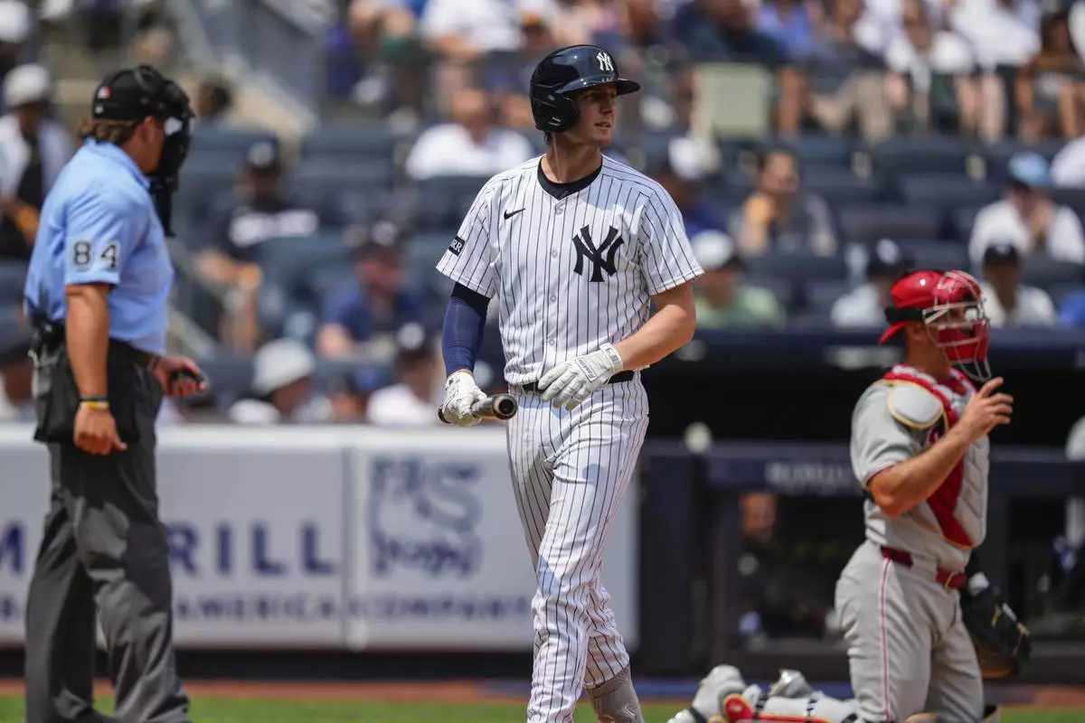 New York Yankees' Ryan McMahon (19) walks away after striking out during the second inning of a baseball game against the Philadelphia Phillies, Saturday, July 26, 2025, in New York. (AP Photo/Yuki Iwamura)