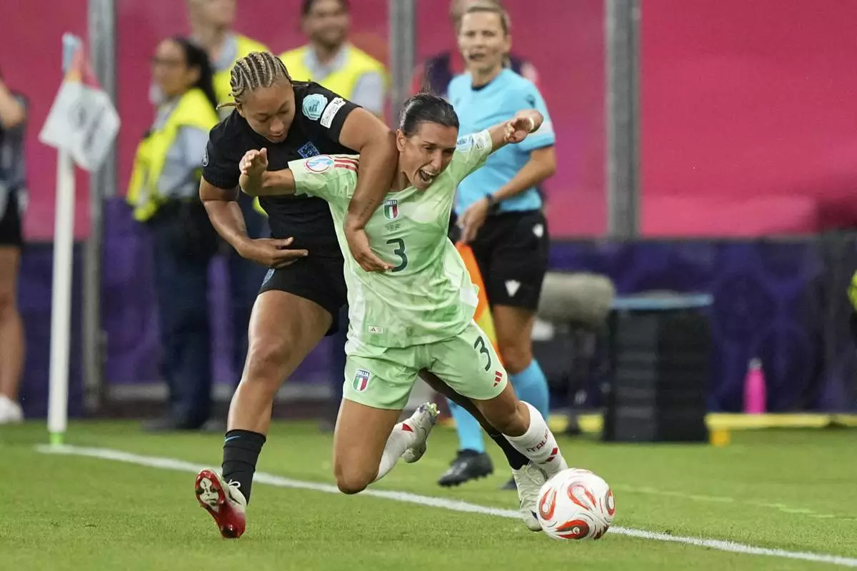 England's Lauren James, left, challenges for the ball with Italy's Lucia Di Guglielmo during the Women's Euro 2025 semifinals soccer match between England and Italy at Stade de Geneve in Geneva, Switzerland, Tuesday, July 22, 2025. (AP Photo/Martin Meissner)