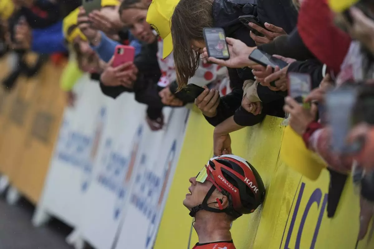 Cycling fans take images of Netherlands' Thymen Arensman after he crossed the finish line to win the nineteenth stage of the Tour de France cycling race over 93.1 kilometers (57.85 miles) with start in Albertville and finish in La Plagne, France, Friday, July 25, 2025. (AP Photo/Thibault Camus)