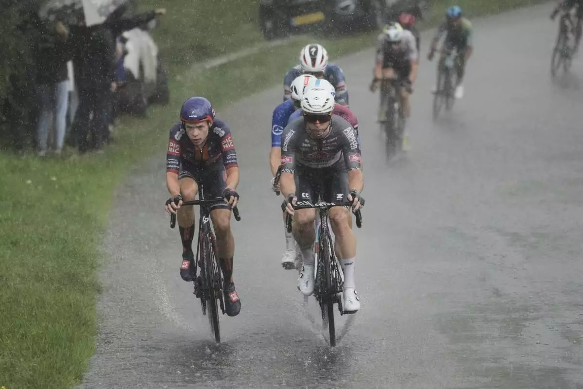 Stage winner Australia's Kaden Groves, center front, and Netherlands' Frank van den Broek, ride in the breakaway in a downpour during the twentieth stage of the Tour de France cycling race over 184.2 kilometers (114.5 miles) with start in Nantua and finish in Pontarlier, France, Saturday, July 26, 2025. (AP Photo/Thibault Camus)