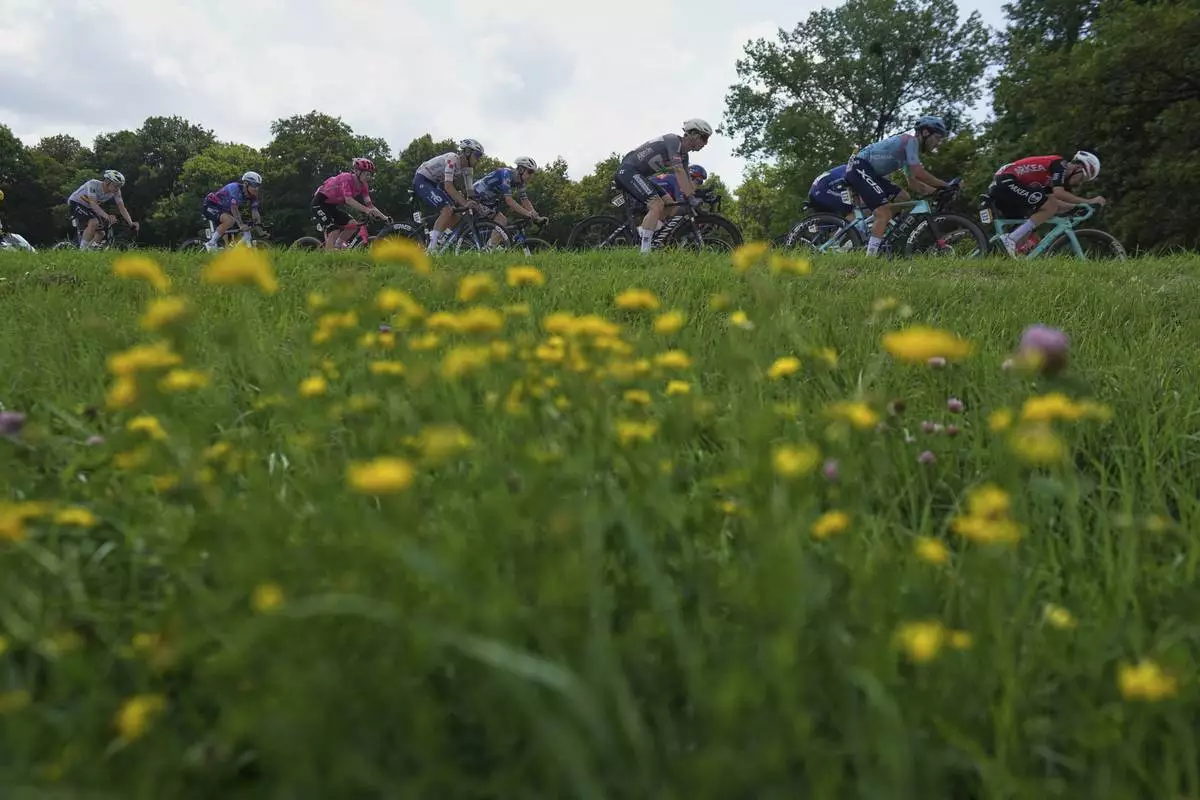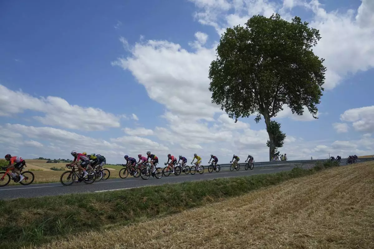 The group with Slovenia's Tadej Pogacar, wearing the overall leader's yellow jersey, center, rides during the fifteenth stage of the Tour de France cycling race over 169.3 kilometers (105.2 miles) with start in Muret and finish in Carcassone, France, Sunday, July 20, 2025. (AP Photo/Mosa'ab Elshamy)