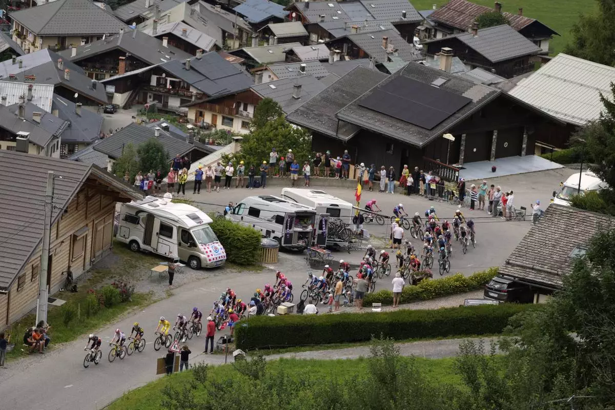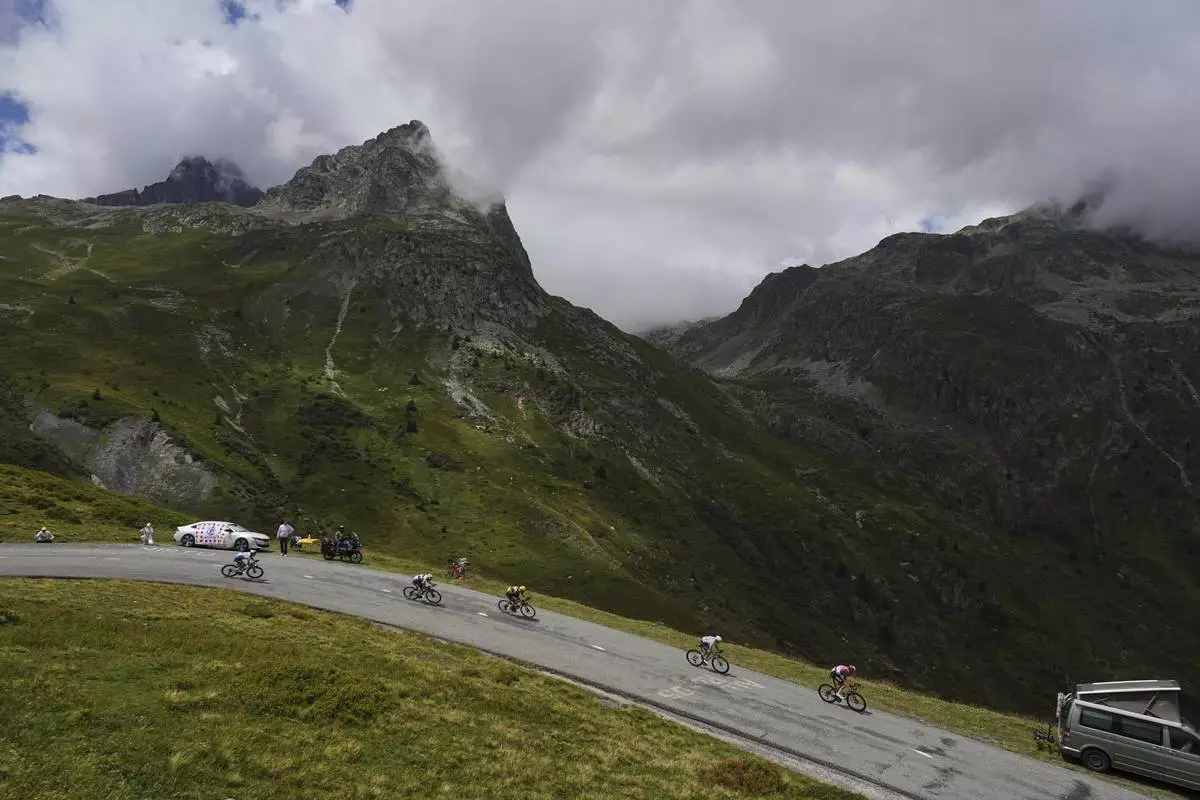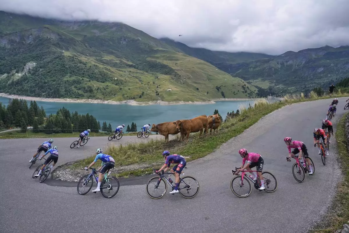 The pack with Slovenia's Tadej Pogacar, wearing the overall leader's yellow jersey, climbs Col du Pre during the nineteenth stage of the Tour de France cycling race over 93.1 kilometers (57.85 miles) with start in Albertville and finish in La Plagne, France, Friday, July 25, 2025. (AP Photo/Mosa'ab Elshamy)