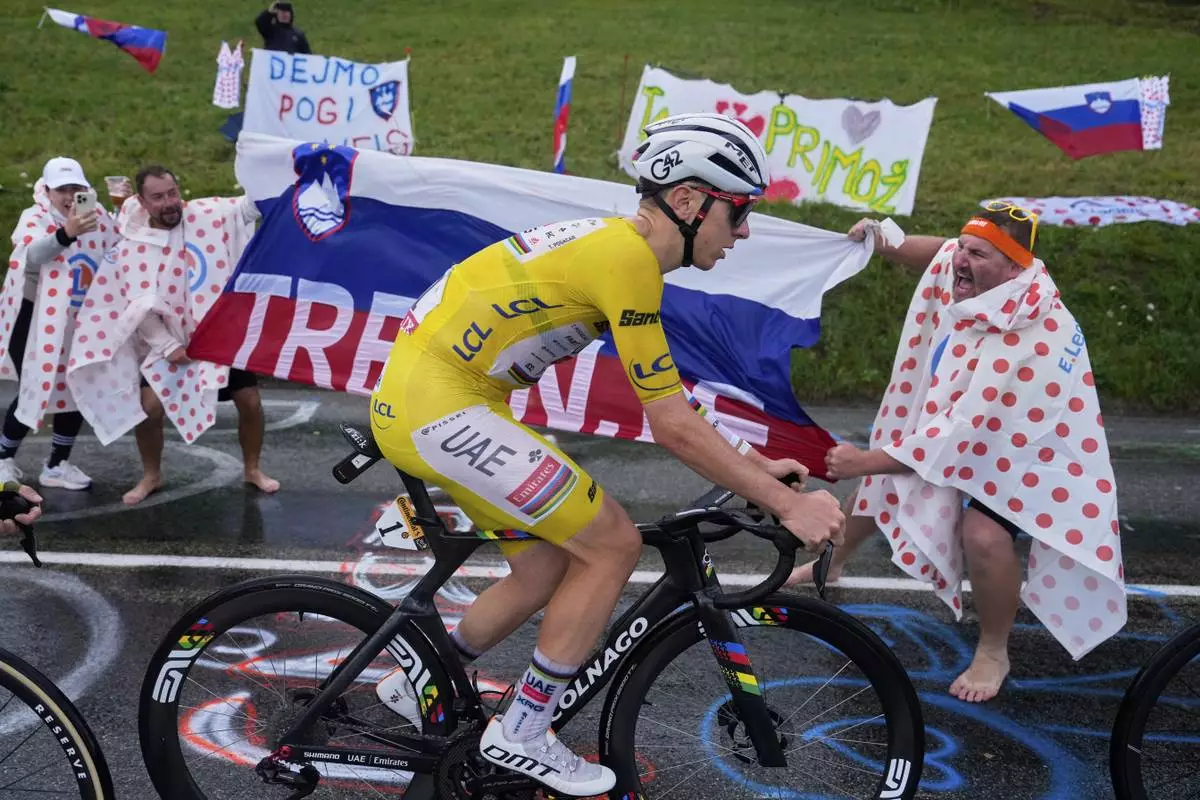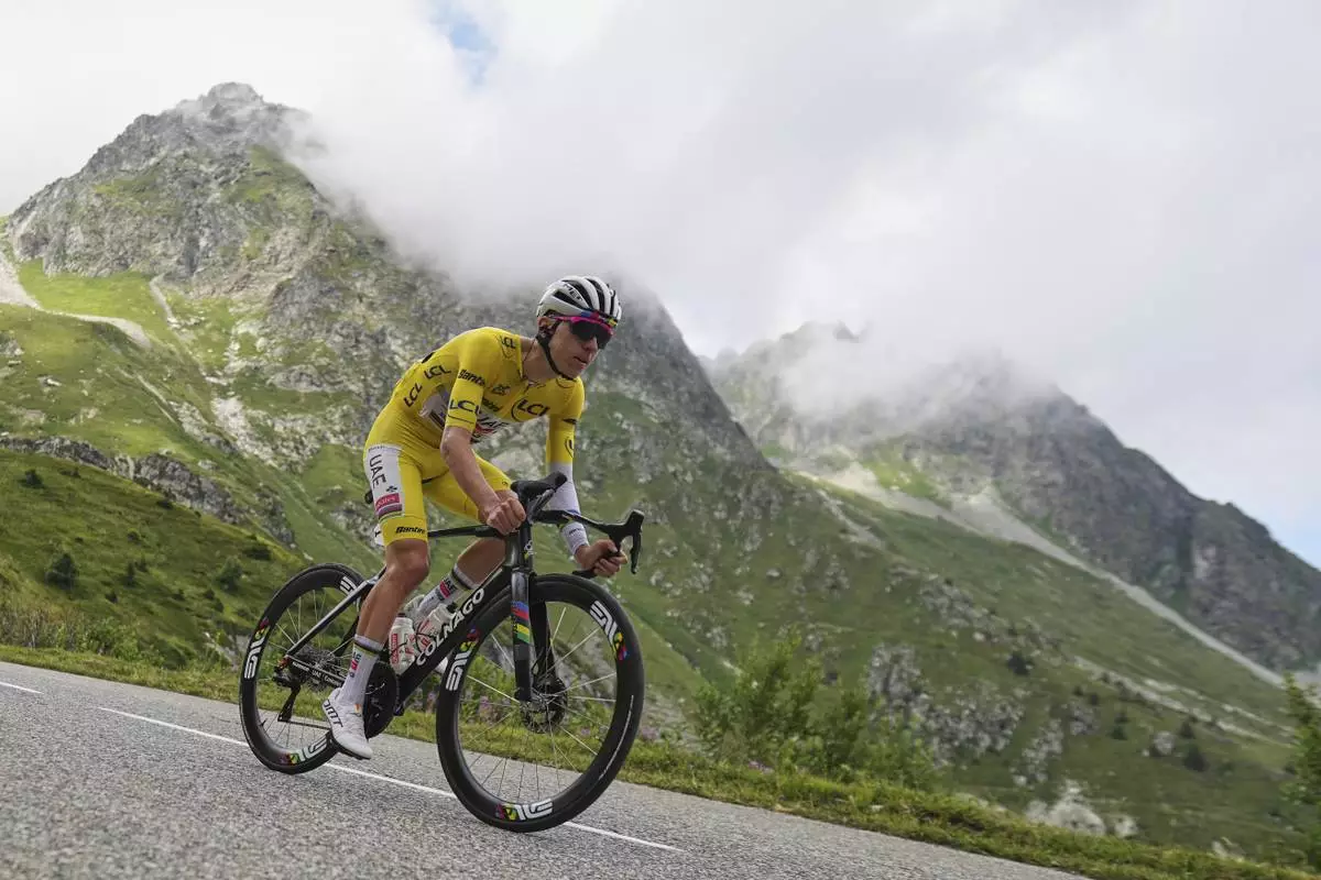 Slovenia's Tadej Pogacar, wearing the overall leader's yellow jersey, climbs towards La Plagne during the nineteenth stage of the Tour de France cycling race over 93.1 kilometers (57.85 miles) with start in Albertville and finish in La Plagne, France, Friday, July 25, 2025. (AP Photo/Mosa'ab Elshamy)