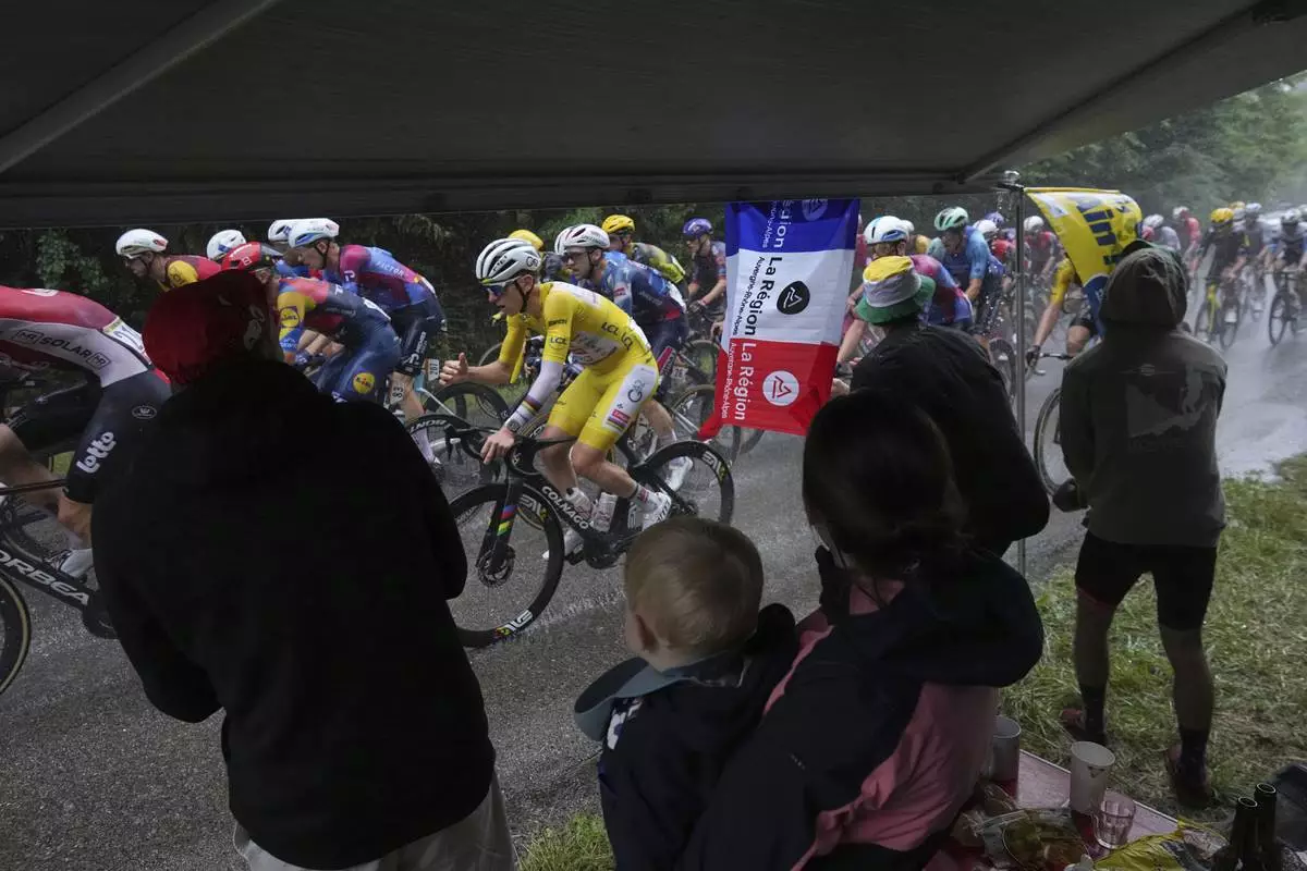 Spectators take cover under an awning as the pack with Slovenia's Tadej Pogacar, wearing the overall leader's yellow jersey, rides in the rain during the twentieth stage of the Tour de France cycling race over 184.2 kilometers (114.5 miles) with start in Nantua and finish in Pontarlier, France, Saturday, July 26, 2025. (AP Photo/Thibault Camus)