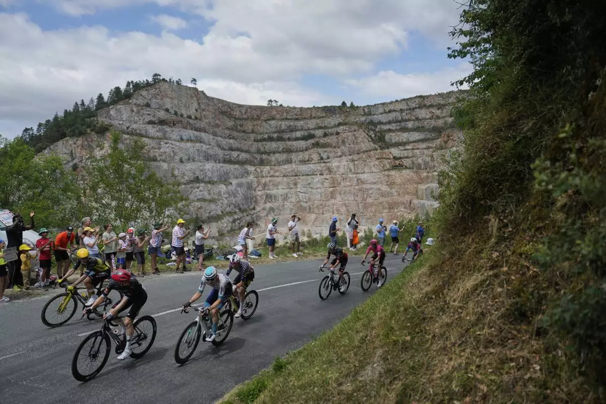 The breakaway group with Australia's Michael Storer, front, Belgium's Victor Campenaerts, yellow helmet, Slovenia's Matej Mohoric, blue helmet, Quinn Simmons of the U.S., wearing the national champion's jersey of the U.S.A., Belgium's Tim Wellens, third from right, Neilson Powless of the U.S., second right, and Kazakhstan's Alexey Lutsenko, half visible in the corner, ride during the fifteenth stage of the Tour de France cycling race over 169.3 kilometers (105.2 miles) with start in Muret and finish in Carcassone, France, Sunday, July 20, 2025. (AP Photo/Mosa'ab Elshamy)