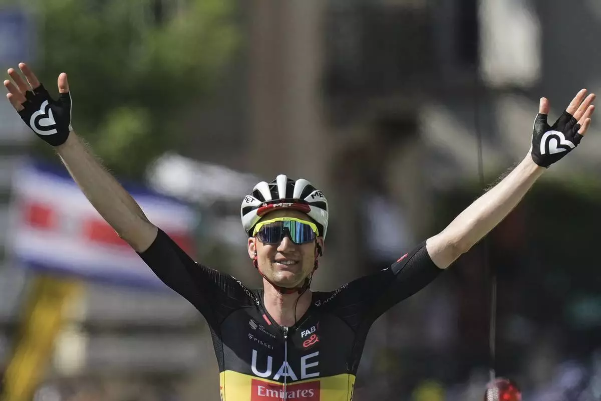 Australia's Kaden Groves crosses the finish line to win the twentieth stage of the Tour de France cycling race over 184.2 kilometers (114.5 miles) with start in Nantua and finish in Pontarlier, France, Saturday, July 26, 2025. (AP Photo/Mosa'ab Elshamy)