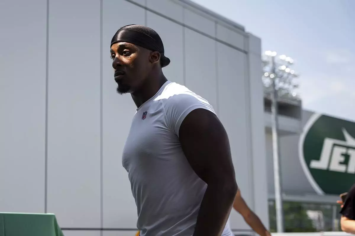 New York Jets running back Breece Hall (20) enters a press conference following practice at the team's NFL football training camp, Saturday, July 26, 2025, in Florham Park, N.J. (AP Photo/Angelina Katsanis)