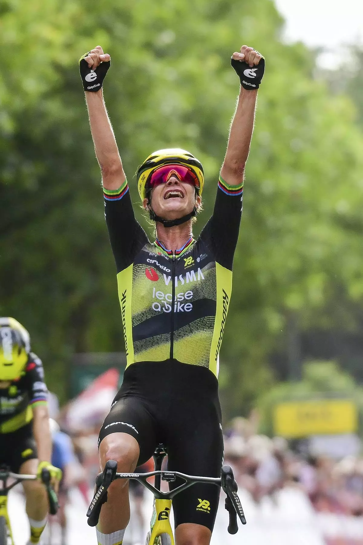 The 38-year-old Dutchwoman overtook her Visma–Lease a Bike teammate Pauline Ferrand-Prévot approaching the line, and then held off Mauritian rider Kim Le Court in the closing meters of a grueling uphill finish.