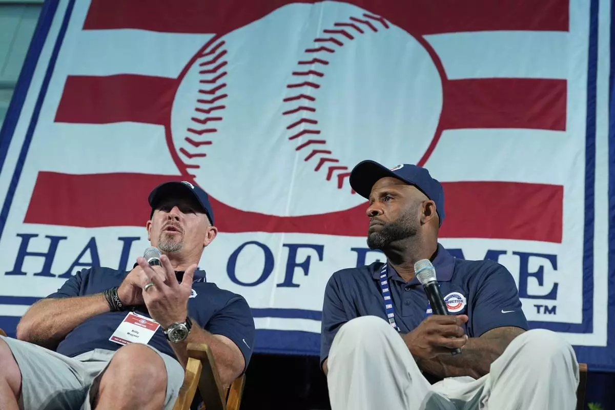 Baseball Hall of Fame inductees Billy Wagner, left, and CC Sabathia speak to reporters during a news conference in Cooperstown, N.Y., Saturday, July 26, 2025. (AP Photo/Seth Wenig)