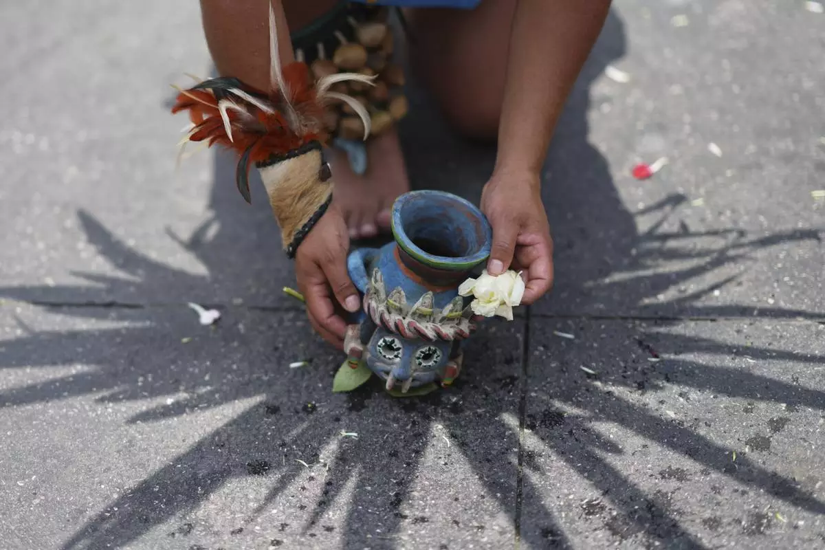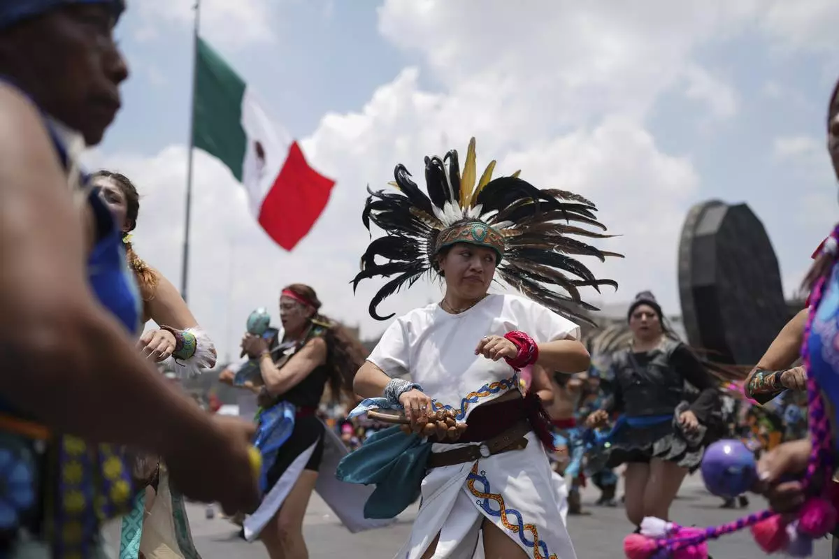 Artists in Indigenous clothing reenacted the founding of the Aztec capital in front of the country’s top officials in Mexico City's main square. Later, hundreds of dancers dressed in traditional clothing, feather headdresses, drums, and ankle rattles made of seeds performed sacred dances meant to connect with nature.