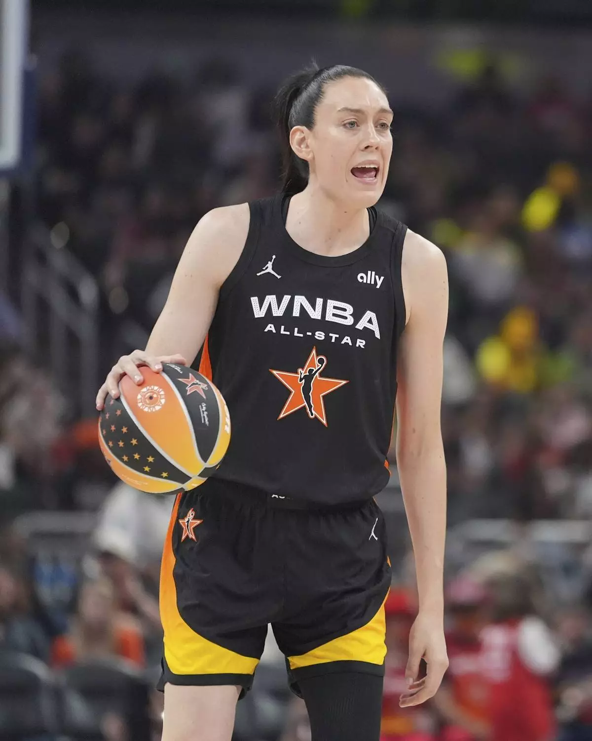 New York Liberty's Breanna Stewart dribbles during the second half of a WNBA All-Star basketball game against Team Clark, Saturday, July 19, 2025, in Indianapolis. (AP Photo/Michael Conroy)