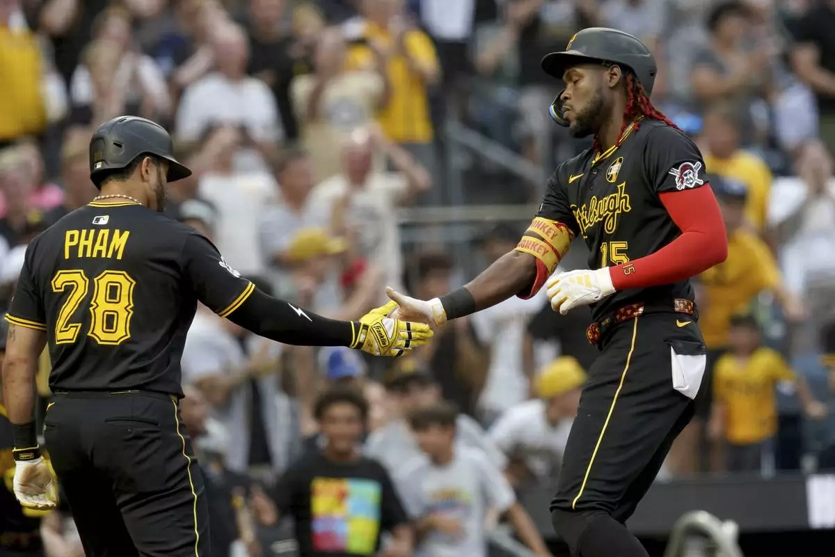 Pittsburgh Pirates' Oneil Cruz, right, is greeted by Tommy Pham, left, after hitting a two-run home run during the second inning of a baseball game against the Arizona Diamondbacks Saturday, July 26, 2025, in Pittsburgh. (AP Photo/Matt Freed)