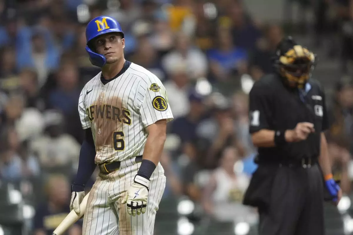 Milwaukee Brewers' Isaac Collins looks on after striking out during the ninth inning of a baseball game against the Miami Marlins, Saturday, July 26, 2025, in Milwaukee. (AP Photo/Aaron Gash)