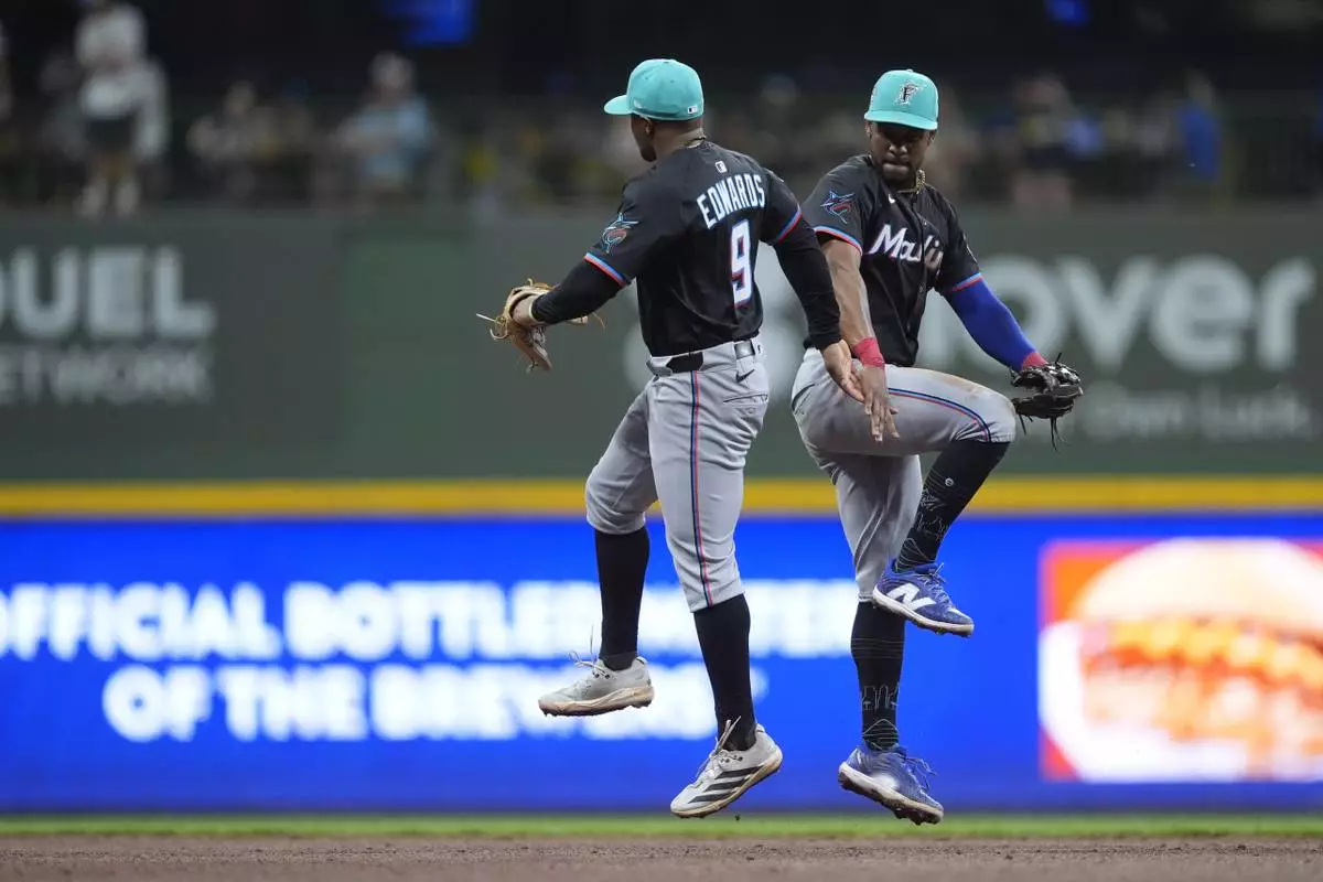 Miami Marlins' Xavier Edwards (9) celebrates with Otto Lopez, right, after a baseball game against the Milwaukee Brewers, Saturday, July 26, 2025, in Milwaukee. (AP Photo/Aaron Gash)