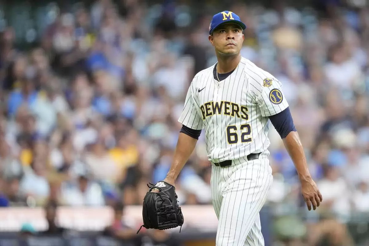 Milwaukee Brewers' Jose Quintana walks to the dugout during the fifth inning of a baseball game against the Miami Marlins, Saturday, July 26, 2025, in Milwaukee. (AP Photo/Aaron Gash)