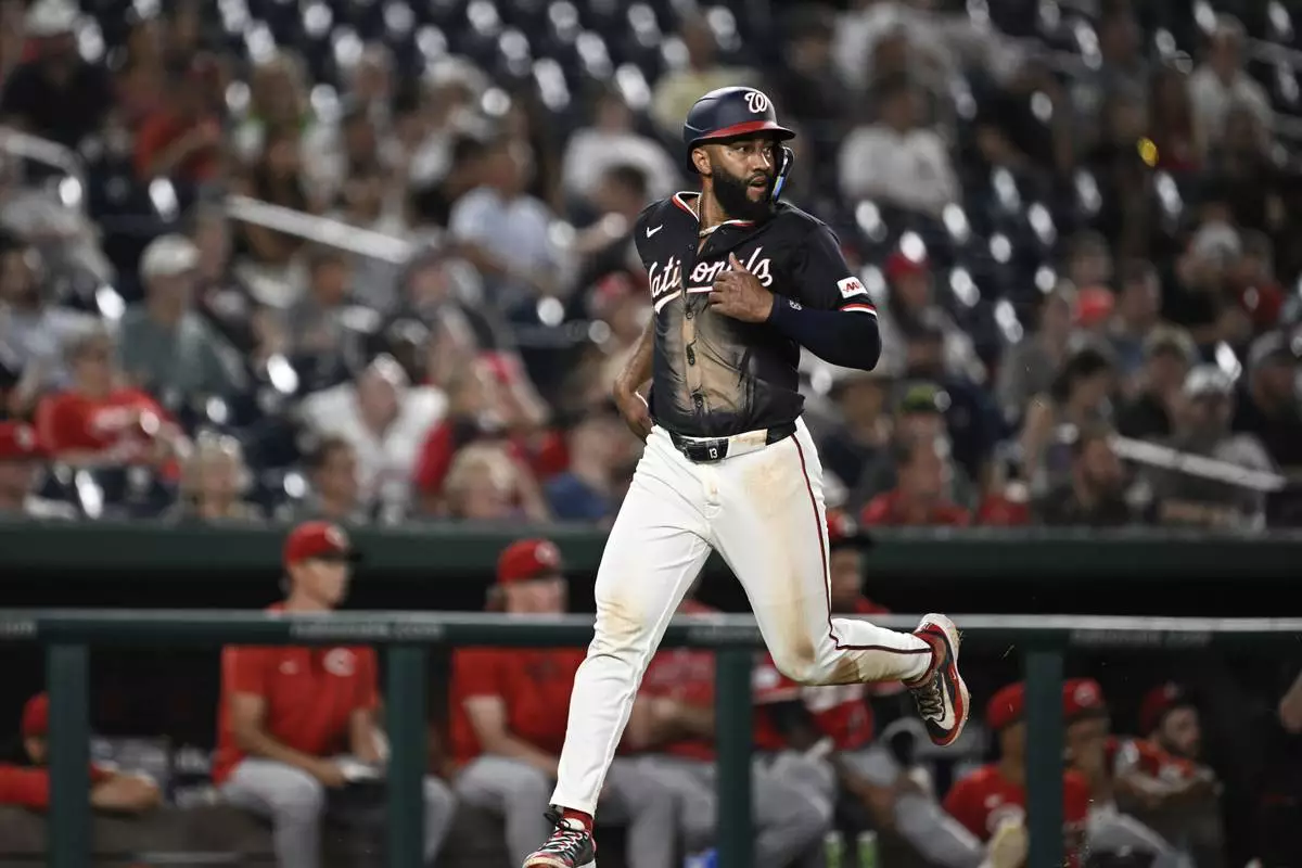 Washington Nationals' Amed Rosario scores on a single hit by Jacob Young off Cincinnati Reds pitcher Graham Ashcraft during the sixth inning of a baseball game in Washington, Monday, July 21, 2025. (AP Photo/Terrance Williams)