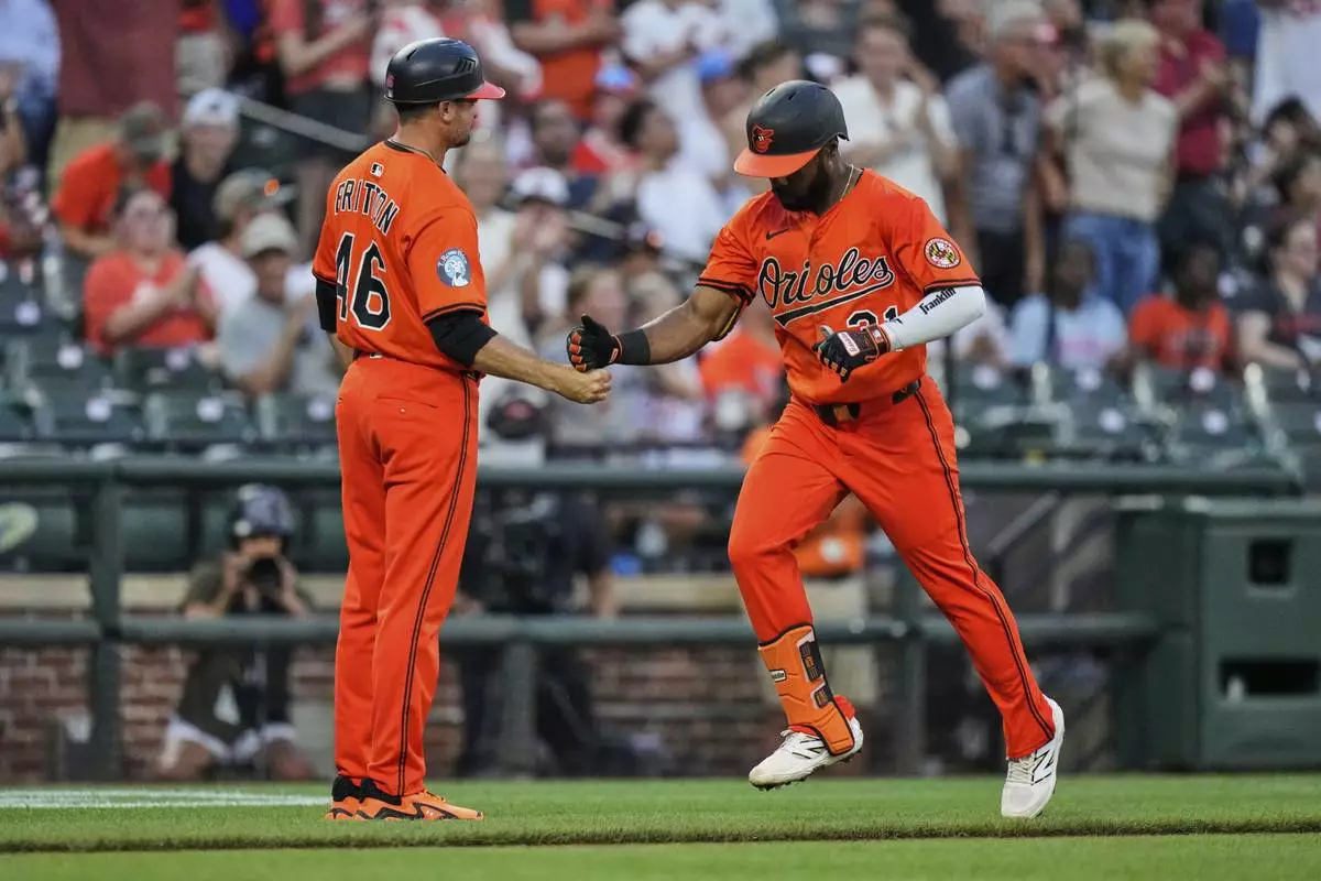 Baltimore Orioles' Cedric Mullins, right, celebrates with interim third base/infield coach Buck Britton (46) after hitting a three-run home run during the fourth inning of a baseball game against the Colorado Rockies, Saturday, July 26, 2025, in Baltimore. (AP Photo/Stephanie Scarbrough)