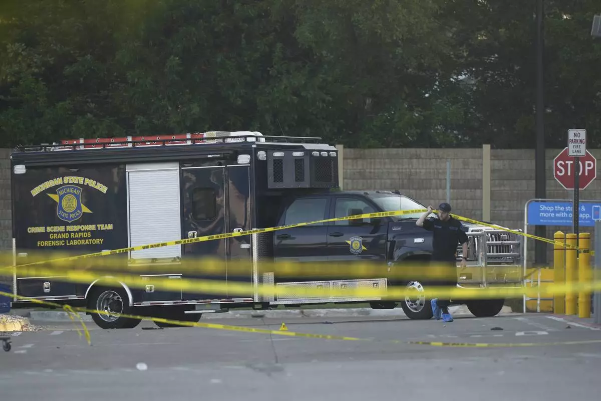 Law enforcement officers investigate outside of a Walmart, Sunday, July 27, 2025, where a multiple stabbing took place on Saturday, in Traverse City, Mich. (AP Photo/Ryan Sun)