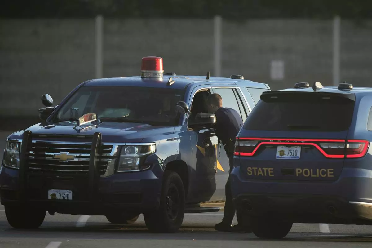 Law enforcement officers are seen stationed outside a Walmart where several people were stabbed in a violent attack Saturday, July 26, 2025, in Traverse City, Mich. (AP Photo/Ryan Sun)