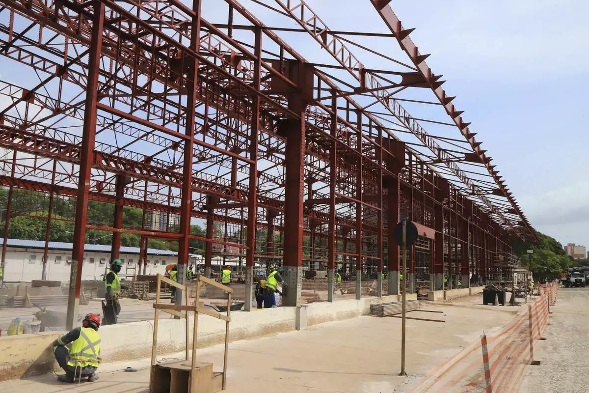FILE - Construction workers make progress in Belem, Brazil, Sept. 24, 2024, on a project for the COP30 U.N. Climate Summit. (AP Photo/Paulo Santos, File)