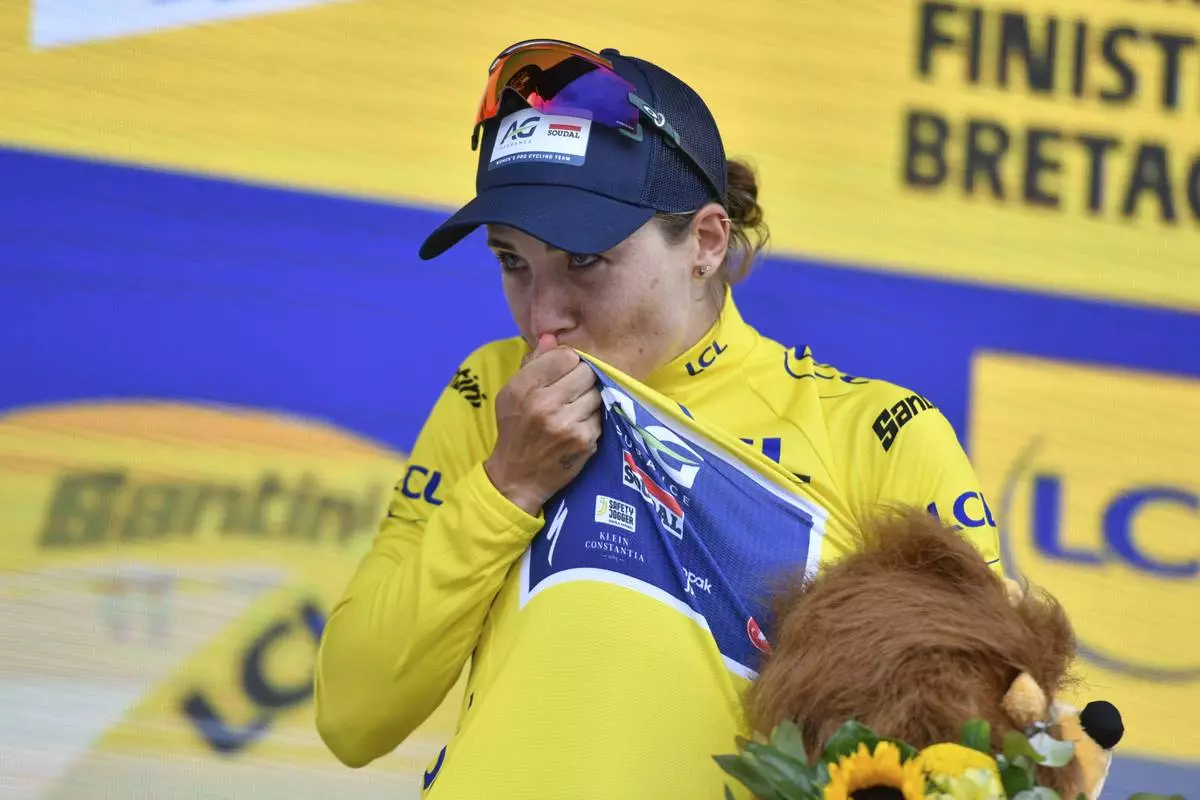 Mauritius' Kim Le Court Pienaar kisses the overall leader's yellow jersey after the second stage of the Women' s Tour de France cycling race that starts in Brest to finish in Quimper, Sunday, July 27, 2025 in Quimper, Brittany, western France. (AP Photo/Mathieu Pattier)