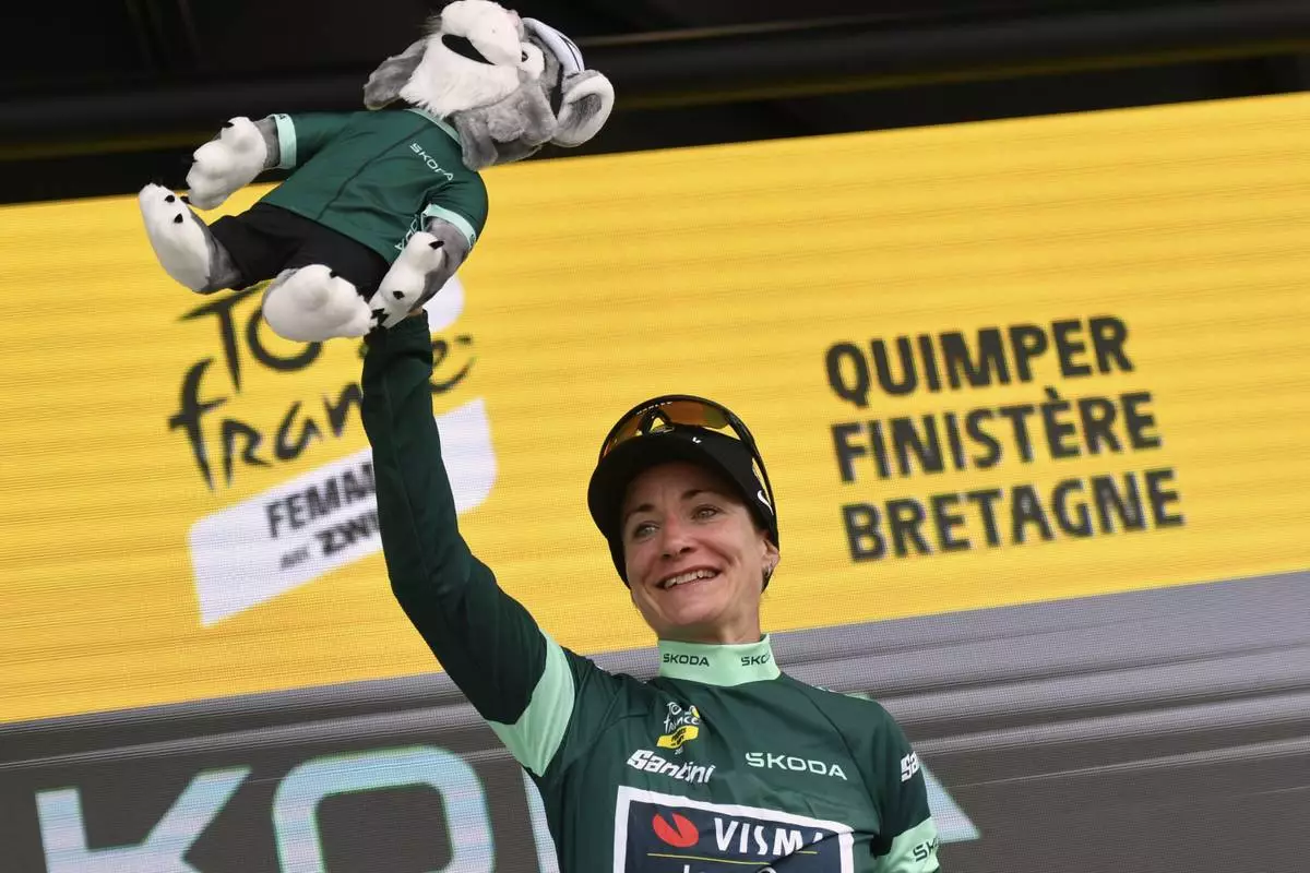 Netherland's Marianne Vos wears the best sprinter jersey on the podium after the second stage of the Women¥s Tour de France cycling race that starts in Brest to finish in Quimper, Sunday, July 27, 2025 in Quimper, Brittany, western France. (AP Photo/Mathieu Pattier)