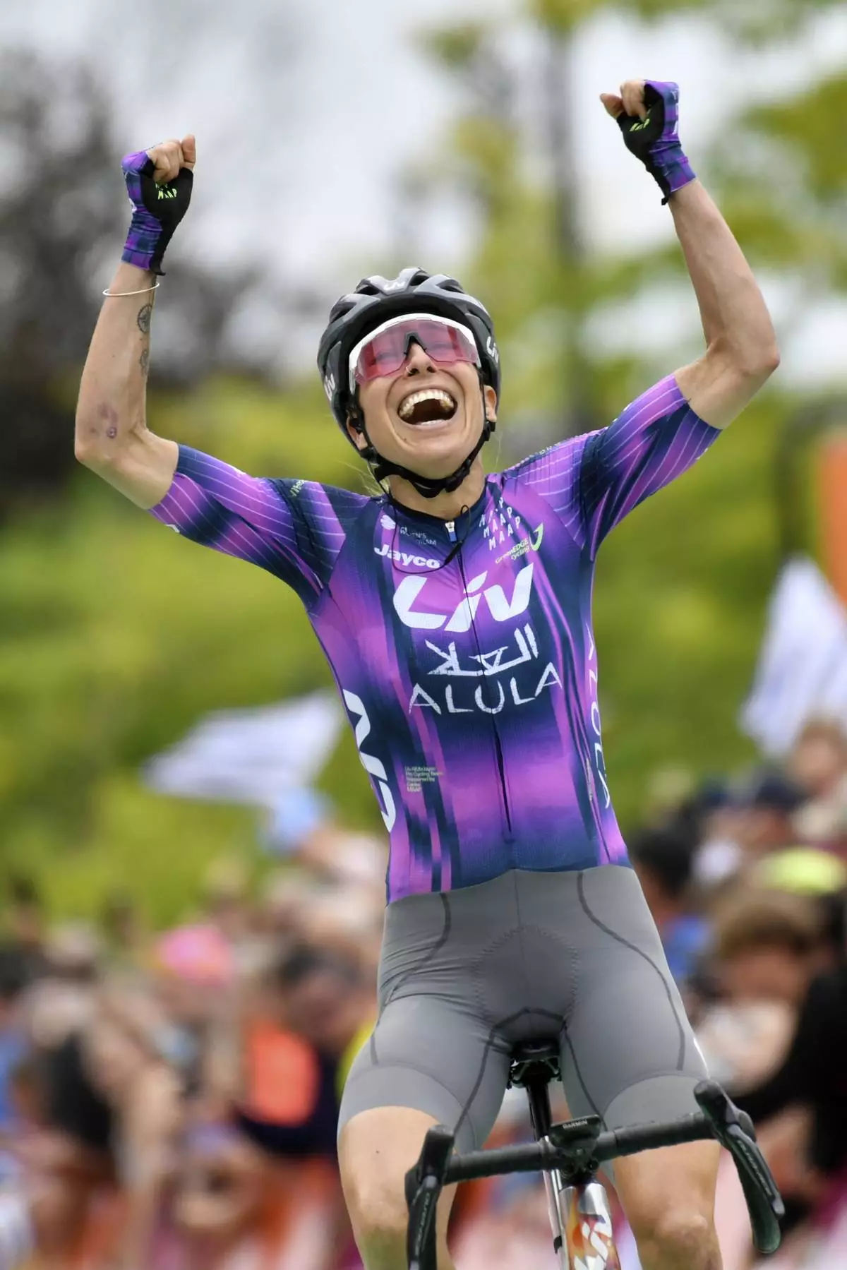 Spain's Mavi Garcia reacts as she crosses the finish line to win the second stage of the Women' s Tour de France cycling race that starts in Brest to finish in Quimper, Sunday, July 27, 2025 in Quimper, Brittany, western France. (AP Photo/Mathieu Pattier)