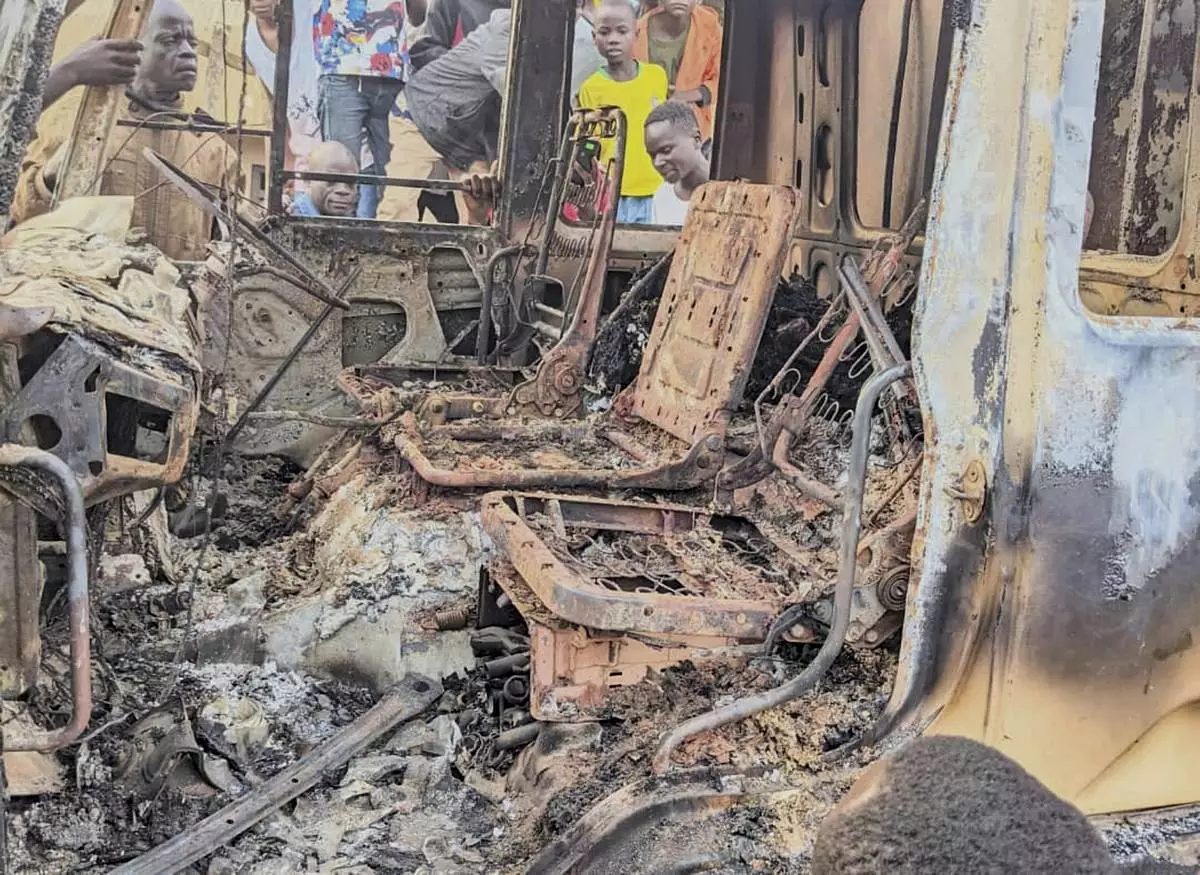 People gather around the charred remains of a burned vehicle following a deadly attack in Komanda, Ituri province of eastern Congo, Sunday, July 27, 2025. (Olivier Okande/UGC via AP)