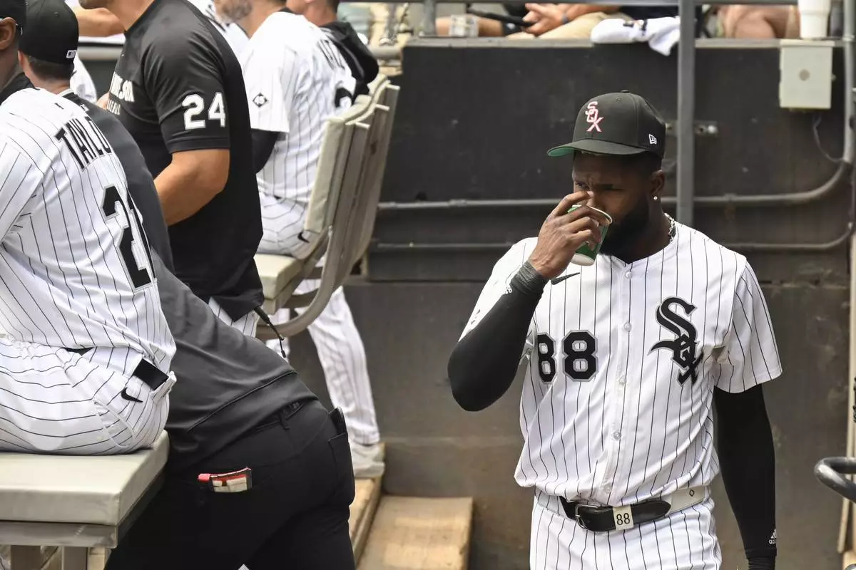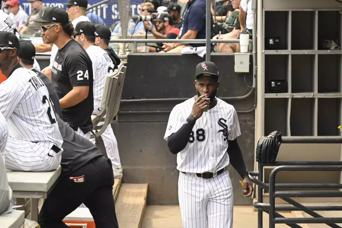 Chicago White Sox outfielder Luis Robert Jr. stands in the dugout during the first inning of a baseball game against the Chicago Cubs, Sunday, July, 27, 2025, in Chicago. (AP Photo/Matt Marton)