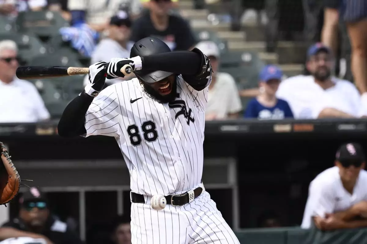 Chicago White Sox's Luis Robert Jr. is hit by a pitch thrown by Chicago Cubs' Daniel Palencia during the ninth inning of a baseball game, Sunday, July, 27, 2025, in Chicago. (AP Photo/Matt Marton)