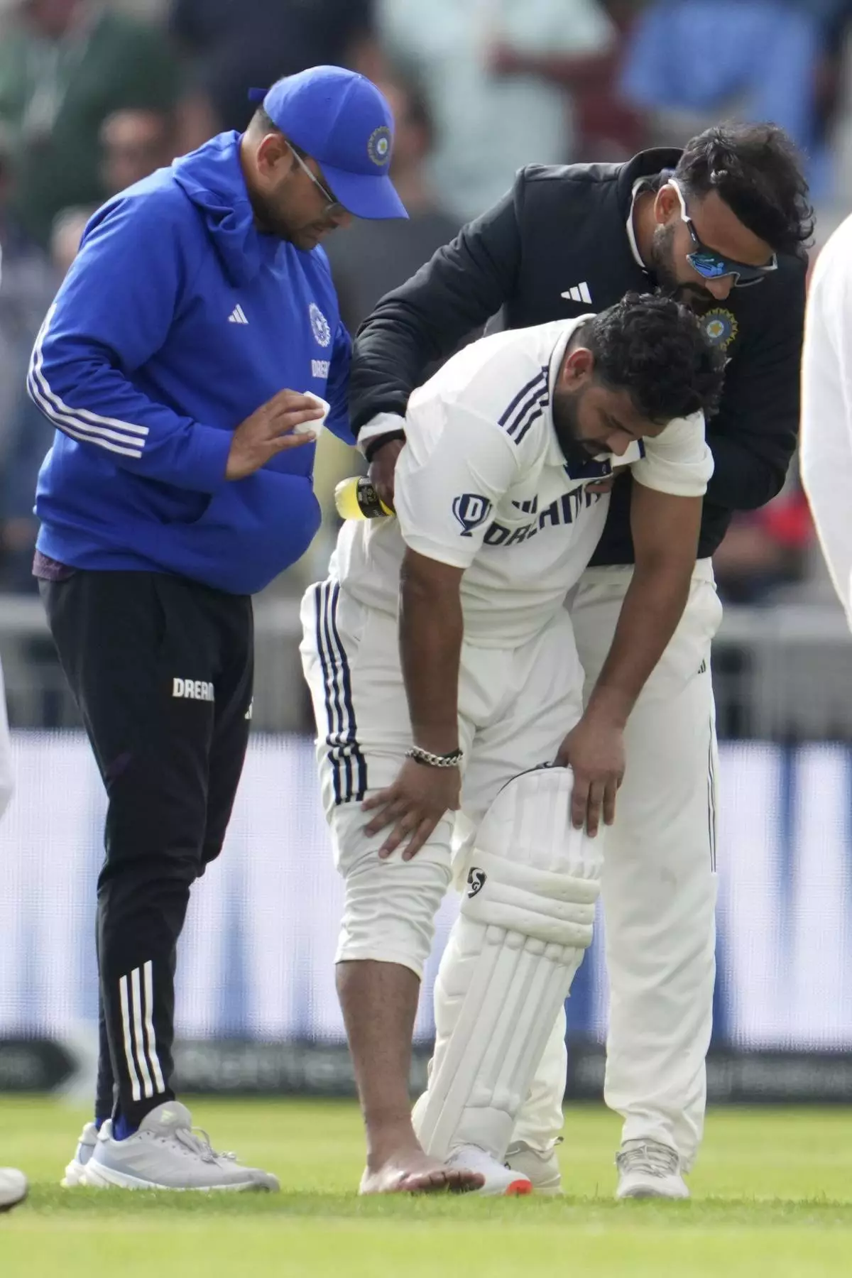 India's Rishabh Pant, center, assisted by team physiotherapist and teammate after he is getting hurt during the fourth cricket test match between England and India at Emirates Old Trafford, Manchester, England, Wednesday, July 23, 2025.(AP Photo/Jon Super)