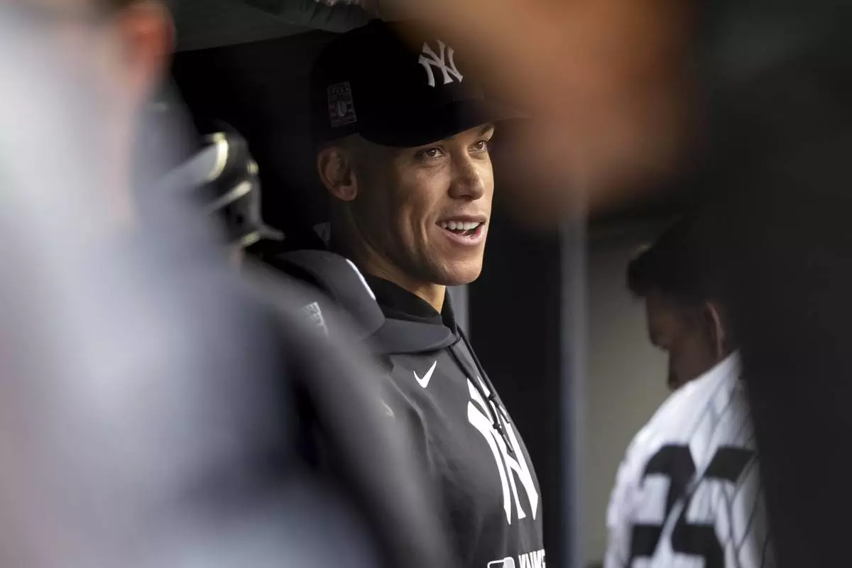 New York Yankees' Aaron Judge, who is out due to an injury, watches from the dugout during the second inning of a baseball game against the Philadelphia Phillies, Sunday, July 27, 2025, in New York. (AP Photo/Angelina Katsanis)
