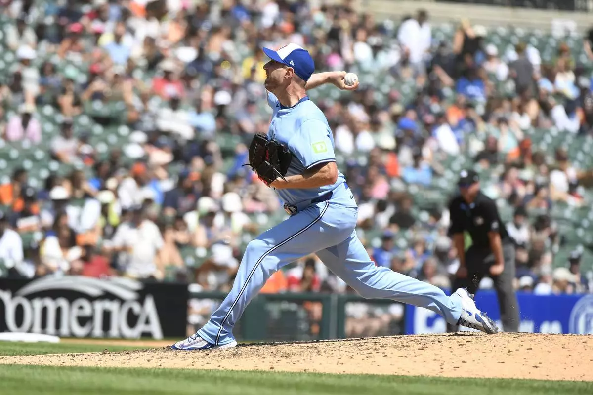 Toronto Blue Jays starting pitcher Max Scherzer throws in the sixth inning of a baseball game against the Detroit Tigers, Sunday, July 27, 2025, in Detroit. (AP Photo/Jose Juarez)
