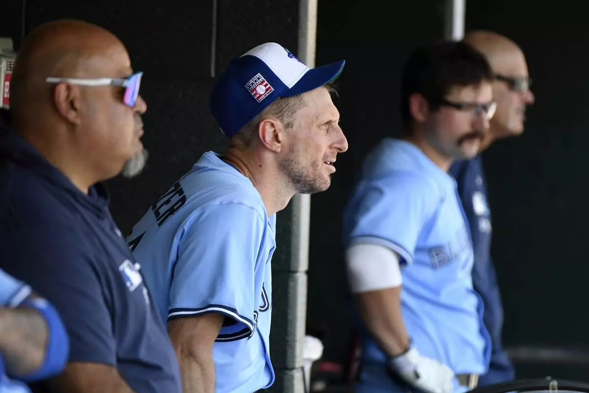 Toronto Blue Jays starting pitcher Max Scherzer watches from the dugout in the sixth inning of a baseball game against the Detroit Tigers, Sunday, July 27, 2025, in Detroit. (AP Photo/Jose Juarez)
