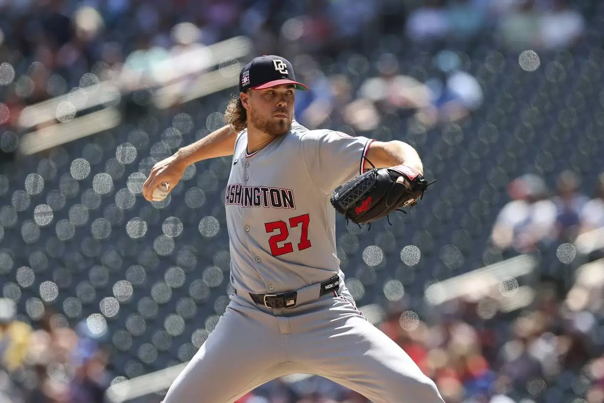 Washington Nationals pitcher Jake Irvin throws during the first inning of a baseball game against the Minnesota Twins, Sunday, July 27, 2025, in Minneapolis. (AP Photo/Stacy Bengs)