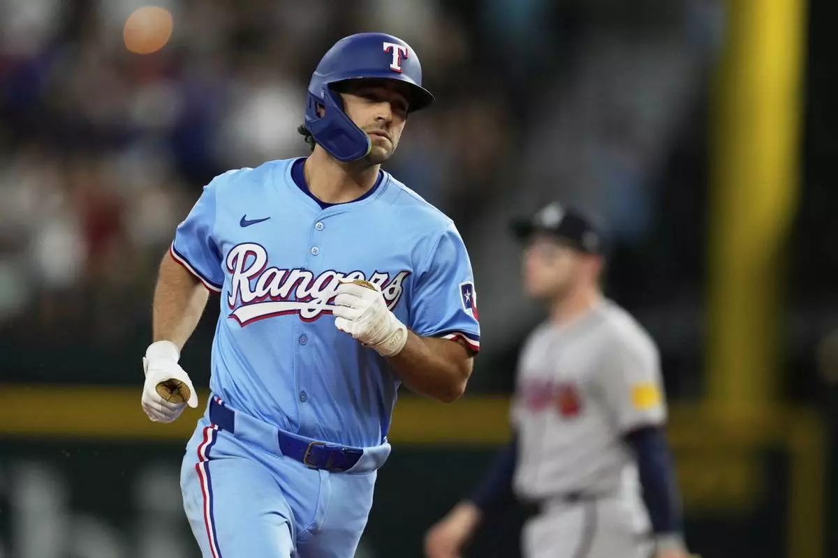 Texas Rangers' Josh Smith rounds the bases after hitting a two-run home run against the Atlanta Braves in the second inning of a baseball game Sunday, July 27, 2025, in Arlington, Texas. (AP Photo/Tony Gutierrez)