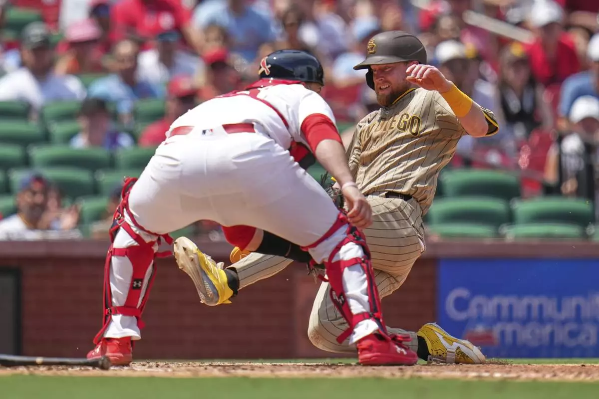 San Diego Padres' Jake Cronenworth, right, scores past St. Louis Cardinals catcher Pedro Pages during the fourth inning of a baseball game Sunday, July 27, 2025, in St. Louis. (AP Photo/Jeff Roberson)