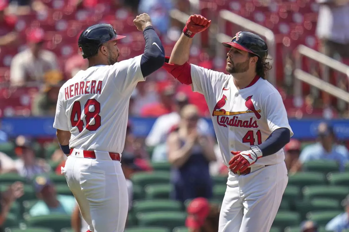 St. Louis Cardinals' Alec Burleson (41) is congratulated by teammate Ivan Herrera (48) after hitting a two-run home run during the sixth inning of a baseball game against the San Diego Padres Sunday, July 27, 2025, in St. Louis. (AP Photo/Jeff Roberson)