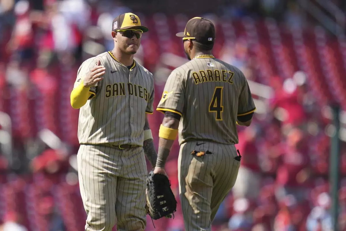 San Diego Padres' Manny Machado, left, and Luis Arraez (4) celebrate a victory over the St. Louis Cardinals in a baseball game Sunday, July 27, 2025, in St. Louis. (AP Photo/Jeff Roberson)